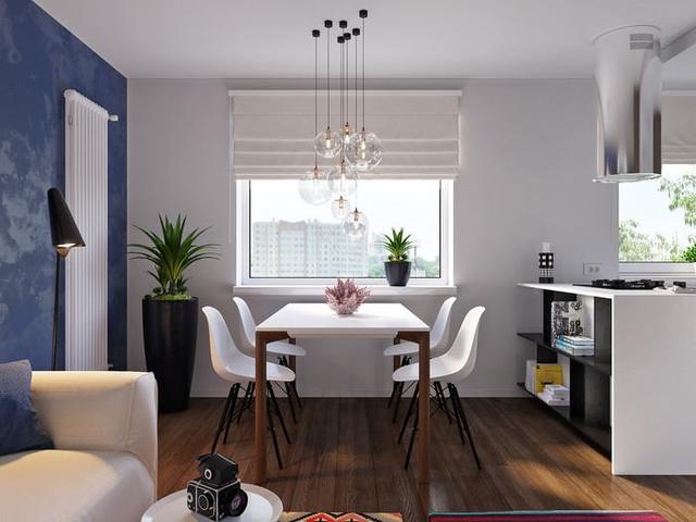 Білий і синій кольори стали основними в інтер'єрі єрі - це яскраве поєднання вигідно підкреслюють дубові панелі, використані в обробці (стіна за телевізором, кухонні шафи і нижні ящики стелажу у вітальні) і гармоніюють з темним підлогою. Недивлячись на обмежений простір, тут знайшлося місце для повноцінного обіднього столу і кухонного острова з варильною поверхнею. Окремо варто згадати і про кухонний фартух: він зроблений з листа металу, пофарбованого в чорний колір, і виглядає монолітно з чорною стільницею.