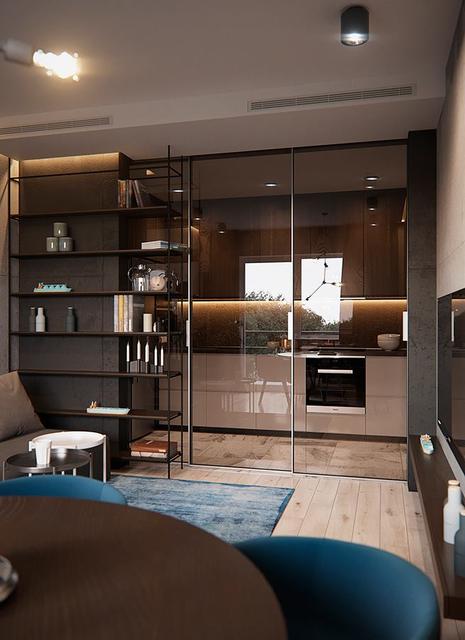 Лаконичные синие акценты - ковер и кресла в столовой. Любимый нами прием зонирования - раздвижная стеклянная стена, отделяющая кухню от гостиной.